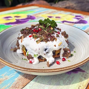 Fattet BeefBread & yogurt topped with eggplants, ground beef, pine nuts, pomegranates and sumac.156 Cal59